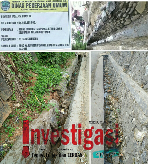 Seperti salah satu contoh proyek pembangunan dan rehabilitasi saluran drainase atau saluran pembuang di Kelurahan Talang Ubi Timur Kecamatan Talang Ubi Kabupaten Penukal Abab Lematang Ilir (PALI) ini. Pelaksana, CV. PRASEDA, pagu anggaran Rp.987.155.000, sumber dana APBD Kabupaten PALI TA 2018, terkesan dikerjakan asal jadi dan tidak pernah ada pengawasan dari pihak terkait dalam hal ini pihak Dinas Pekerjaan Umum Bina Marga (PUBM) Kabupaten PALI.