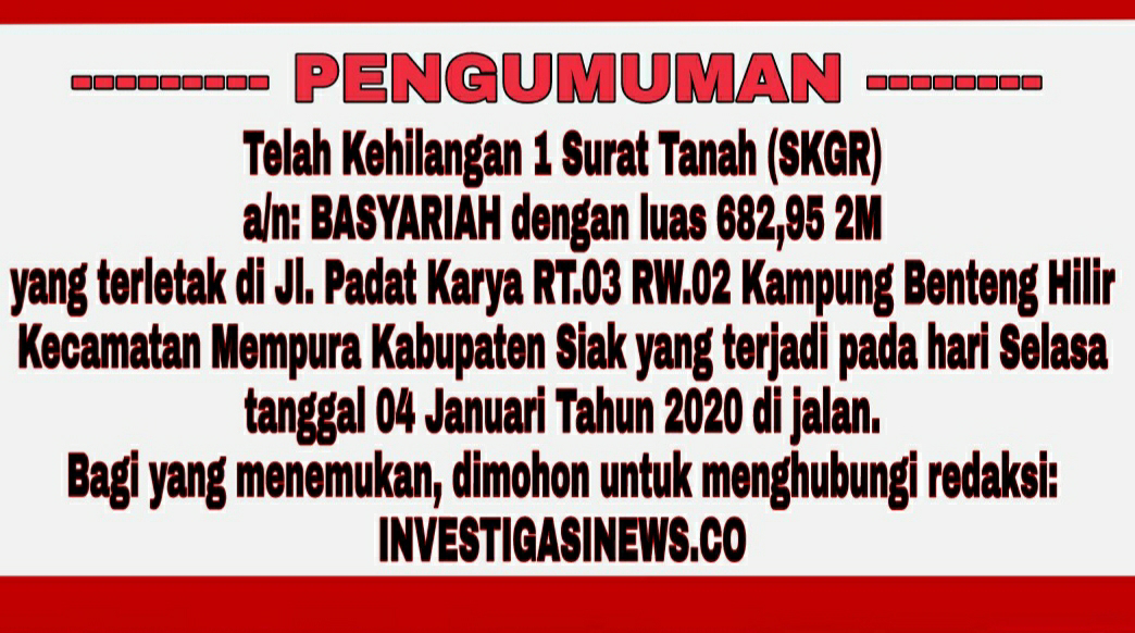 Telah Kehilangan 1 Surat Tanah (SKGR) a/n: BASYARIAH dengan luas 682,95 2M yang terletak di Jl. Padat Karya RT.03 RW.02, Kampung Benteng Hilir, Kecamatan Mempura, Kabupaten Siak yang terjadi pada hari Selasa, tanggal 04 Januari Tahun 2020 di jalan. Bagi yang menemukan, dimohon untuk menghubungi redaksi: INVESTIGASINEWS.CO